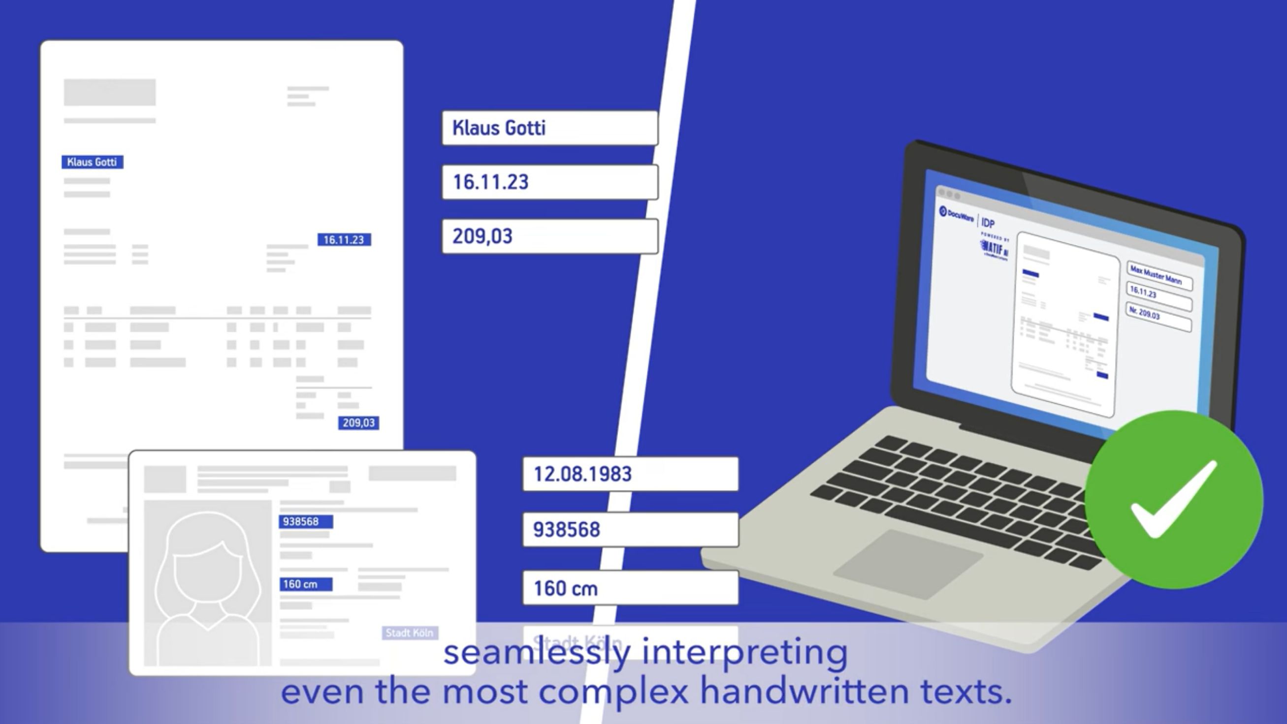 Izkoristite moč svojih dokumentov z natančnim zajemom podatkov, ki ga omogočata DocuWare-ova tehnologija OCR (optično prepoznavanje znakov) in HTR (prepoznavanje rokopisa).