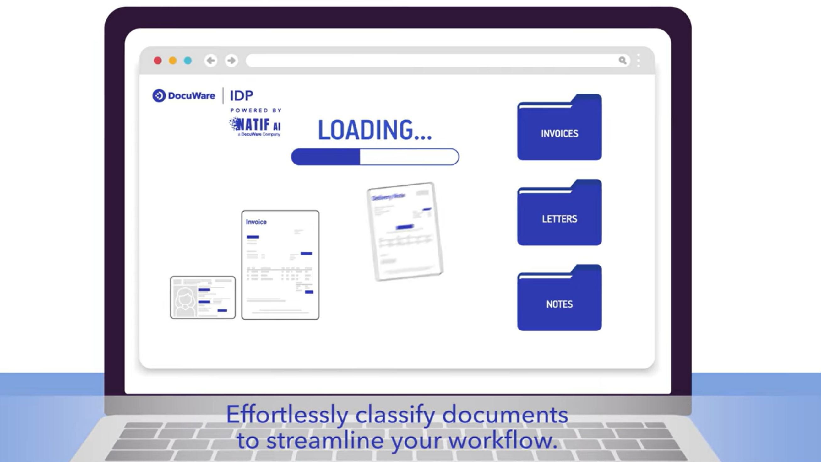 Ko so podatki izluščeni, IDP razvrsti dokumente v vnaprej določene kategorije (računi, naročilnice, obrazci za kadrovsko službo pravne pogodbe odvisno od potreb podjetja). Strojno učenje pomaga IDP-ju prepoznavati različne formate in postopoma izboljševati klasifikacijo. Namesto da bi zaposleni zapravljali ure z ročnim premetavanjem dokumentov, IDP vsak dokument usmeri v pravi potek dela ali na pravi oddelek.