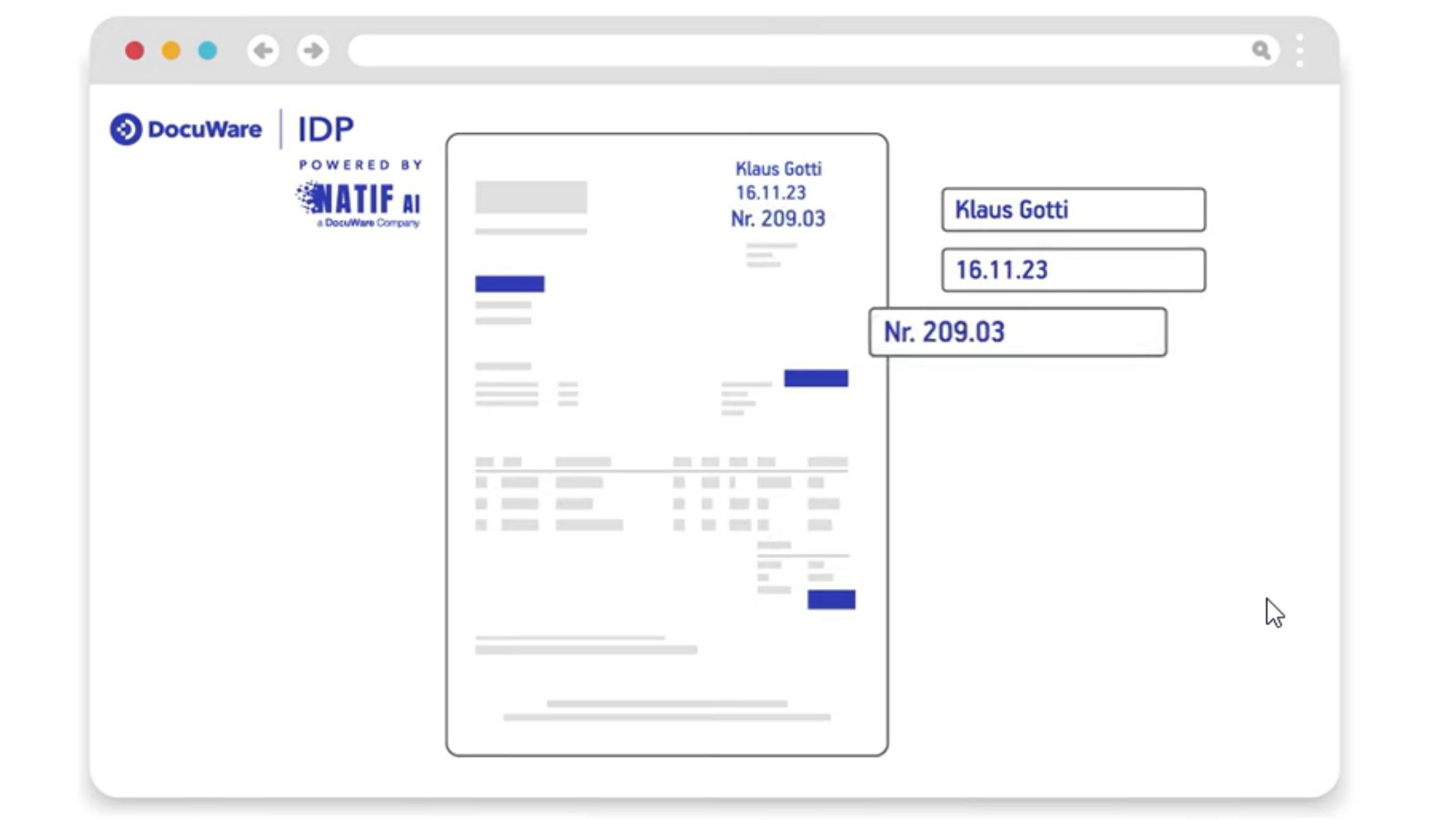 Ko je dokument jasen in uporaben, IDP izlušči strukturirane in nestrukturirane podatke s kombinacijo OCR, obdelave naravnega jezika (NLP) in strojnega učenja (ML). OCR pretvori natisnjeno (ali ročno pisano prek HTR) besedilo v digitalno obliko, NLP pa razume pomen besed in fraz. Tako lahko IDP prepozna številke računov, zneske plačil, pogodbene klavzule in celo imena strank brez vnaprej pripravljenih predlog.